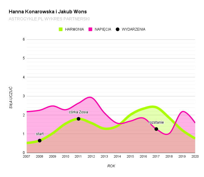 Na wykresie Hanny i Jakuba widać wyraźnie, że nie był to zbyt szczęśliwy związek, różowa linia napięć była przez prawie cały okres trwania relacji dominująca. Nawet w ostatnich latach była wysoko. Niewątpliwie silną stroną tego związku była komunikacja dzięki ładnym aspektom Merkurego.